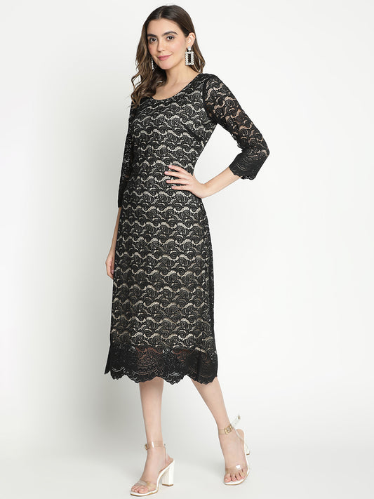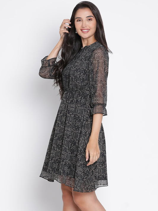 Draax Fashions Women Black Balloon Net Sleeve Dress