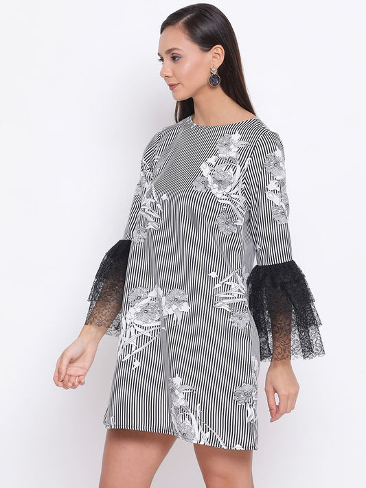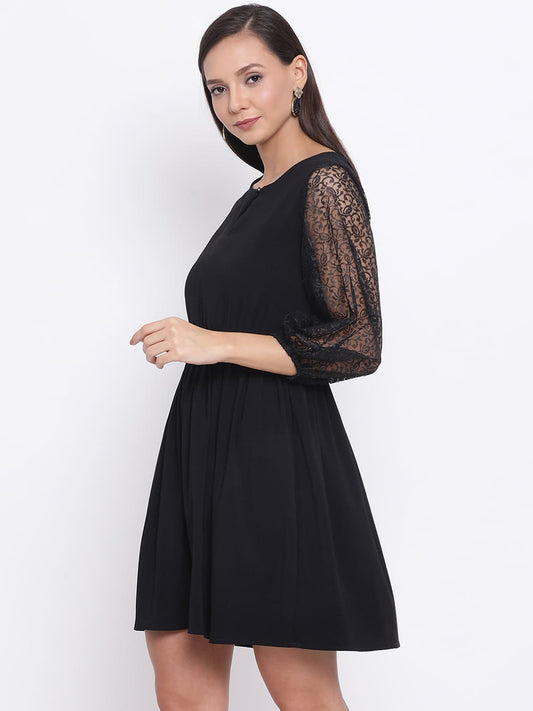 Draax Fashions Women Black Balloon Net Sleeve Dress