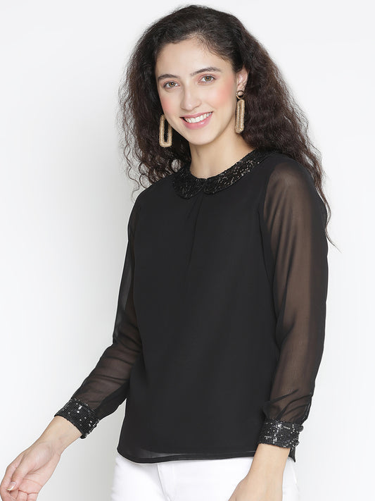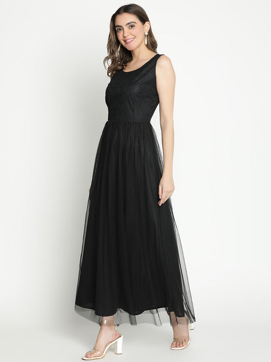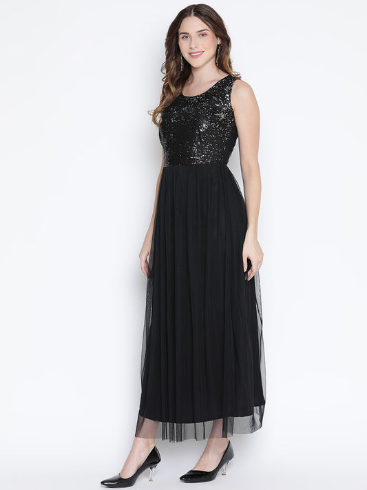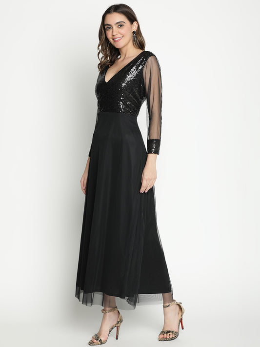 Draax Fashions Women Black Sequined Georgette Long Dress
