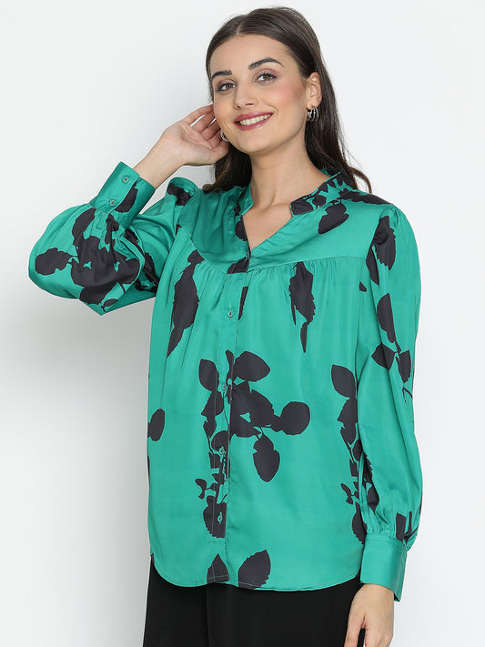 DRAAX FASHIONS Womens Satin Green Printed Full Sleeves Shirt Style Top