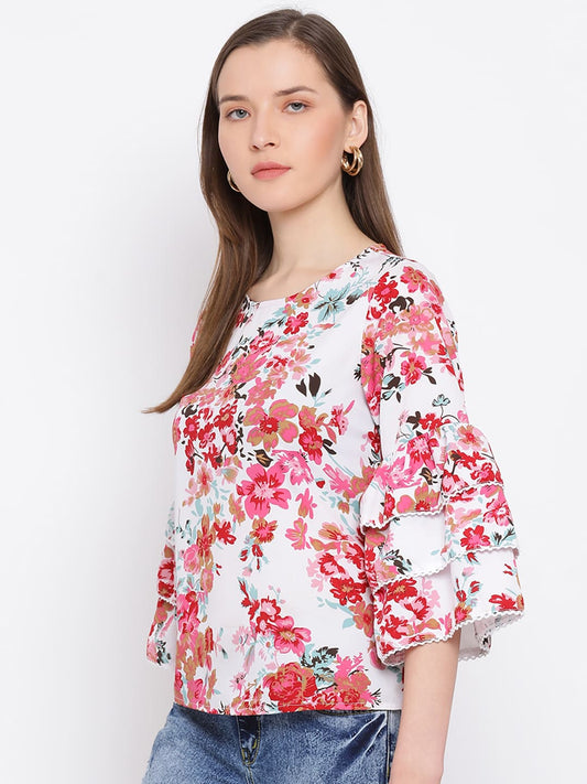 Draax Fashions Women Red And White Print Ruffled Schiffli Peasant Top