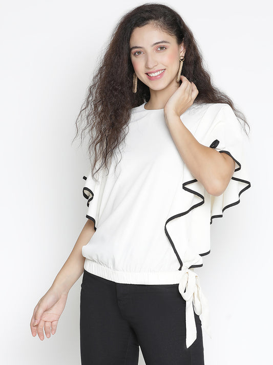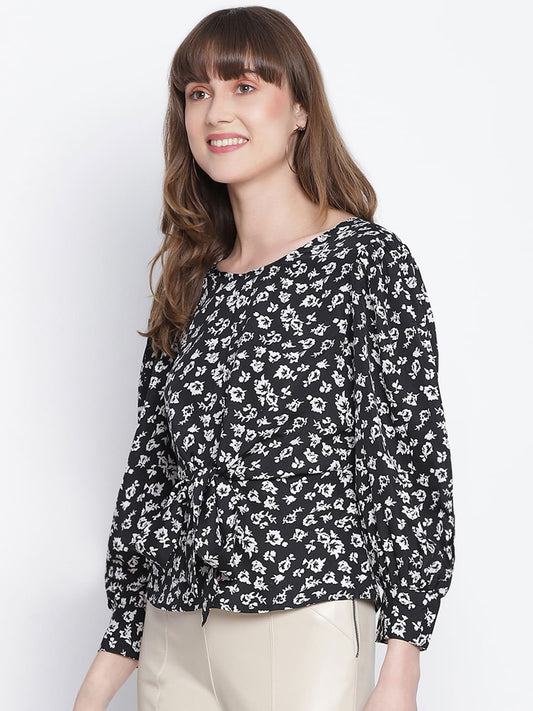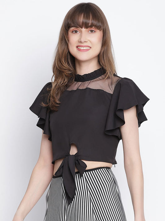 Draax Fashions Women Solid Black Top With Front Knotted Belt