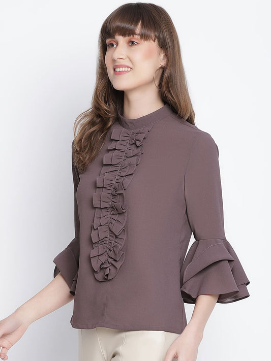 Draax Fashions Women Grey Solid Ruffled Full Sleeves Top