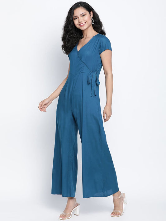 Draax Fashions Women Blue Solid Cropped Wrap Jumpsuit