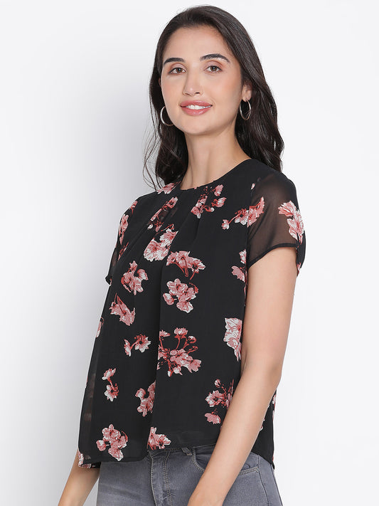 ड्रेक्स फैशन ब्लैक फ्लोरल प्रिंटेड रेगुलर टॉप