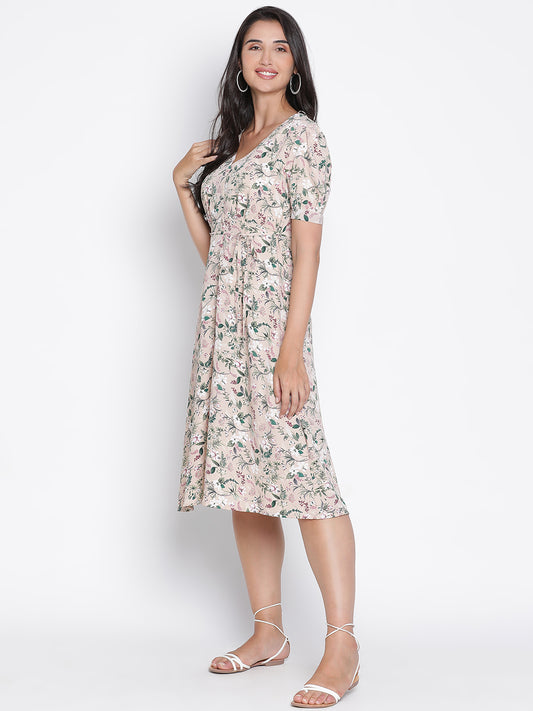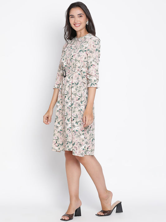 ड्रेक्स फैशन बेज फ्लोरल मल्टीकलर ड्रेस फ्रंट बेल्ट के साथ