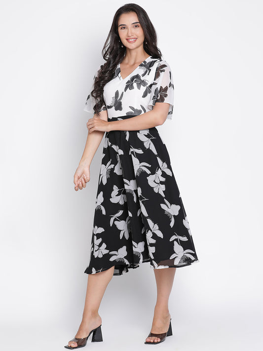 ड्रेक्स फैशन ब्लैक एंड व्हाइट फ्लोरल प्रिंटेड मल्टीकलर ड्रेस