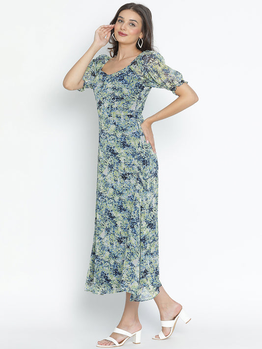 DRAAX FASHIONS महिलाओं के लिए ग्रीन प्रिंटेड शॉर्ट स्लीव्स मिडी ड्रेस