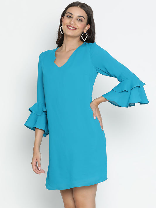 DRAAX FASHIONS महिलाओं के लिए क्वार्टर स्लीव्स वी-नेक लाइट ब्लू ड्रेस