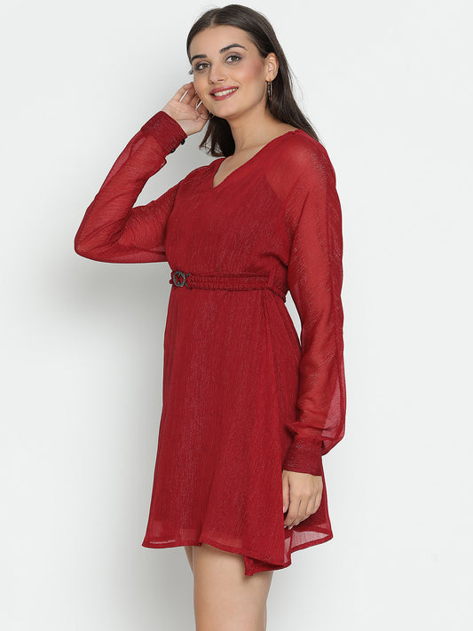 DRAAX FASHIONS महिलाओं की लंबी आस्तीन वी-गर्दन लाल पोशाक