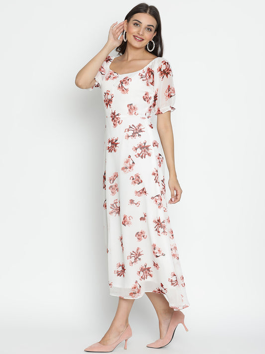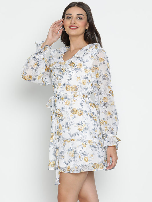 DRAAX FASHIONS महिलाओं के लिए वी-नेक फ्लोरल प्रिंटेड सफ़ेद मिनी ड्रेस