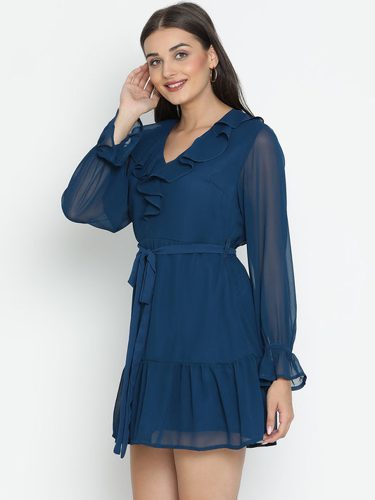 DRAAX FASHIONS महिलाओं के लिए वी-नेक फुल स्लीव्स ब्लू ड्रेस