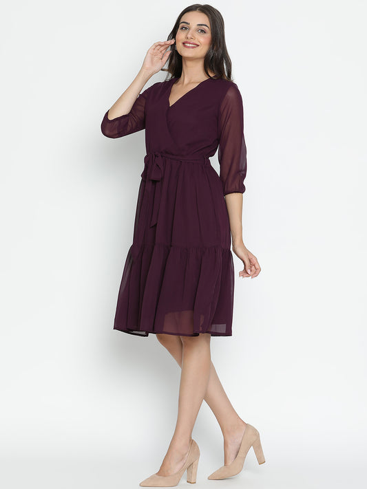 DRAAX FASHIONS महिलाओं के लिए वी-नेक क्वार्टर स्लीव्स मैजेंटा घुटने की लंबाई वाली ड्रेस