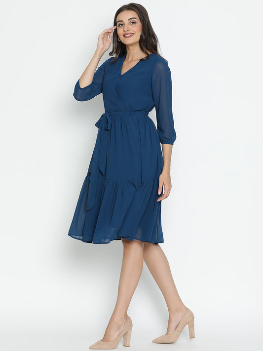 DRAAX FASHIONS महिलाओं के लिए वी-नेक क्वार्टर स्लीव्स नीली घुटने तक की ड्रेस
