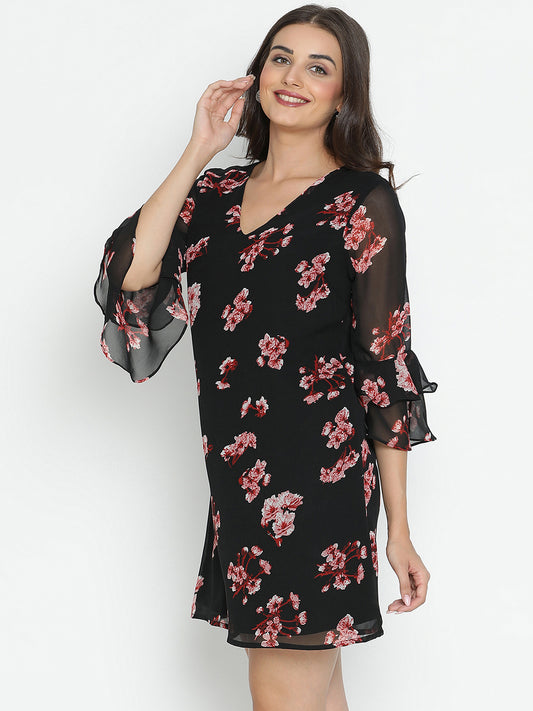 DRAAX FASHIONS महिलाओं के लिए वी-नेक क्वार्टर स्लीव्स फ्लोरल प्रिंटेड ड्रेस